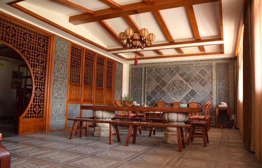 中式裝修的墻面、地面與普通裝修沒什么區別,墻面用白色乳膠漆或淺色壁紙都可以,地面用地板、石材、地磚、地毯均可,只是色彩最好以深色沉穩為主,因為中式家具色彩一般都比較深,這樣整個居室色彩才能諧調。